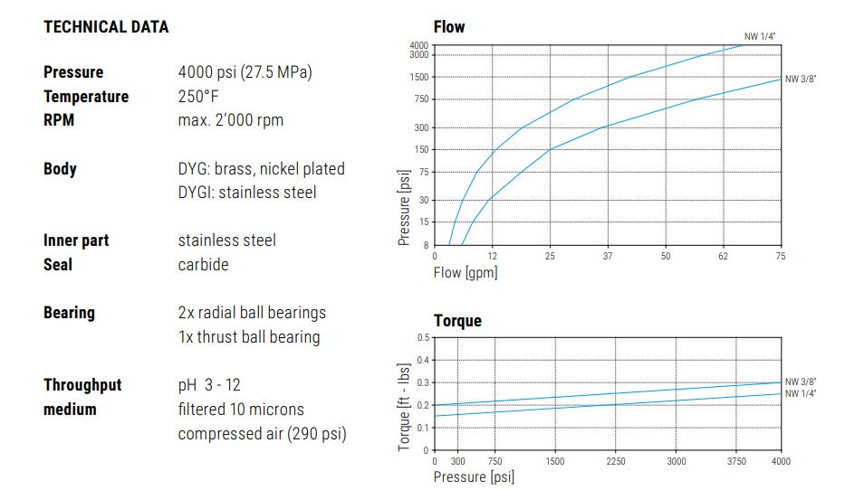 Débit/milieu : pH 3-12 / filtré 10 microns, air comprimé (290 psi)